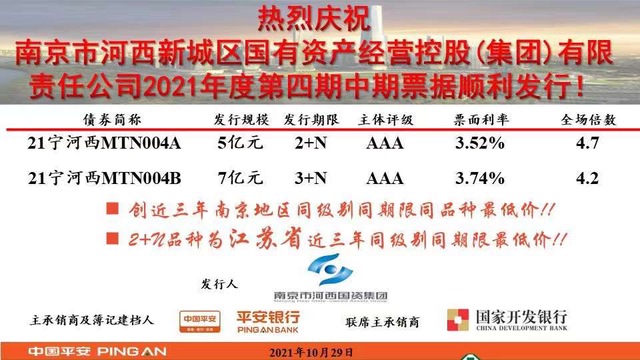 11月1日,集團(tuán)2021年度第四期永續(xù)中票順利發(fā)行,發(fā)行金額12億元,期限3+N年品種7億元,票面利率3.74%;期限2+N年品種5億元,票面利率3.52%,均取得南京市近三年同級別同品種最低價格!