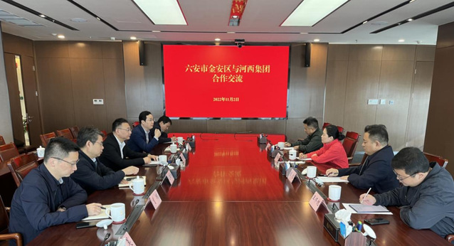 2022年11月2日,六安市金安區(qū)委副書(shū)記、區(qū)長(zhǎng)黃媛媛,金安經(jīng)濟(jì)開(kāi)發(fā)區(qū)管委會(huì)書(shū)記、主任程旭,金安區(qū)政協(xié)副主席方明,金安經(jīng)濟(jì)開(kāi)發(fā)區(qū)投資促進(jìn)局局長(zhǎng)王懷槐一行蒞臨河西集團(tuán)考察交流。河西集團(tuán)總經(jīng)理、黨委副書(shū)記、董事何流,副總經(jīng)理、黨委委員呂道峰,河西集團(tuán)園林經(jīng)濟(jì)公司董事長(zhǎng)趙康兵,南京河西私募基金管理有限公司執(zhí)行董事曹鵬接待并進(jìn)行座談。