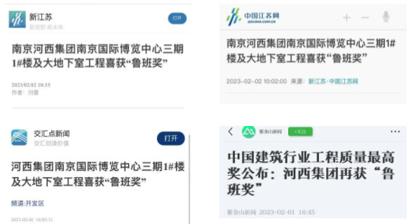 2022—2023年度第一批中國(guó)建設(shè)工程“魯班獎(jiǎng)”名單近日公布,由河西集團(tuán)投資,集團(tuán)河西新城建設(shè)發(fā)展有限公司(下稱(chēng)“新城公司”)代建的南京國(guó)際博覽中心三期1#樓及大地下室工程榜上有名。這也是河西集團(tuán)繼青奧會(huì)議中心、南京國(guó)際博覽中心、河西兒童醫(yī)院等建設(shè)工程之后再創(chuàng)佳績(jī),又一次獲得中國(guó)建筑行業(yè)工程質(zhì)量領(lǐng)域最高榮譽(yù)。