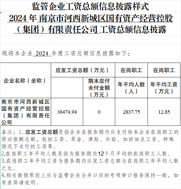 2024年南京市河西新城區(qū)國有資產(chǎn)經(jīng)營控股(集團)有限責(zé)任公司工資總額信息披露